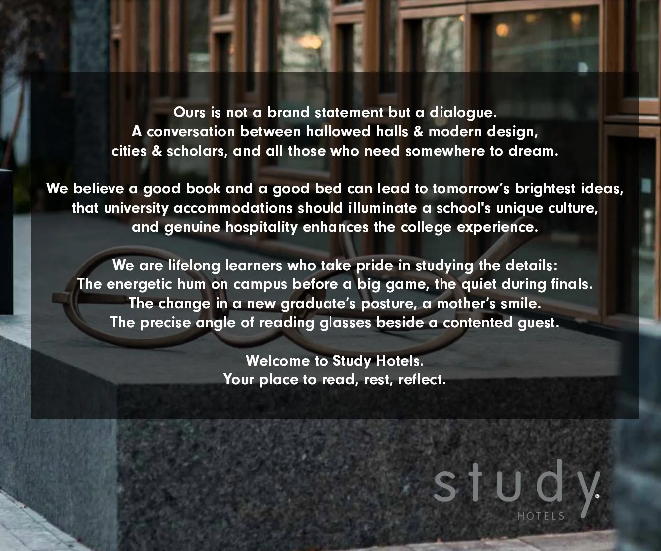 Study Hotels celebrates and enriches the college experience at prominent universities like Yale, UPenn, Johns Hopkins, and University of Chicago. With multiple properties, each a distinct personality, they needed to articulate their brand identity in order to establish a uniting vision. I worked directly with the founder of Study Hotels to develop a Verbal Identity for the brand, which included strategy, messaging, and voice & tone.